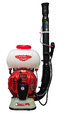 The agricultural mist blower is a tool used to spray a mixture of water (or oil) and phytosanitary products (active ingredient) and direct it on the crop to perform pesticides treatments (insecticides and fungicides), foliar fertilizer, and more. The Cifarelli’s mist blower is a backed machine, that is “worn” by the operator as a backpack; it is equipped with a two-stroke engine (1) that works with a mixture of petrol and oil 2T and that develops 5 HP of power, on whose shaft is assembled a fan (2).